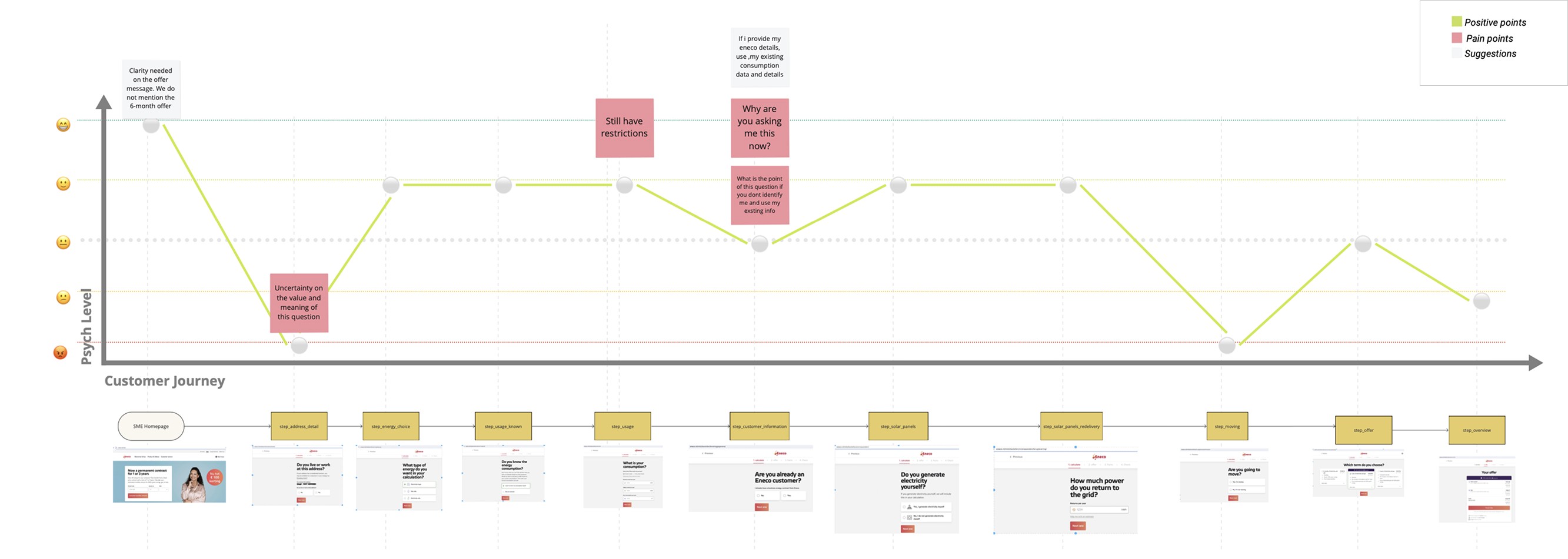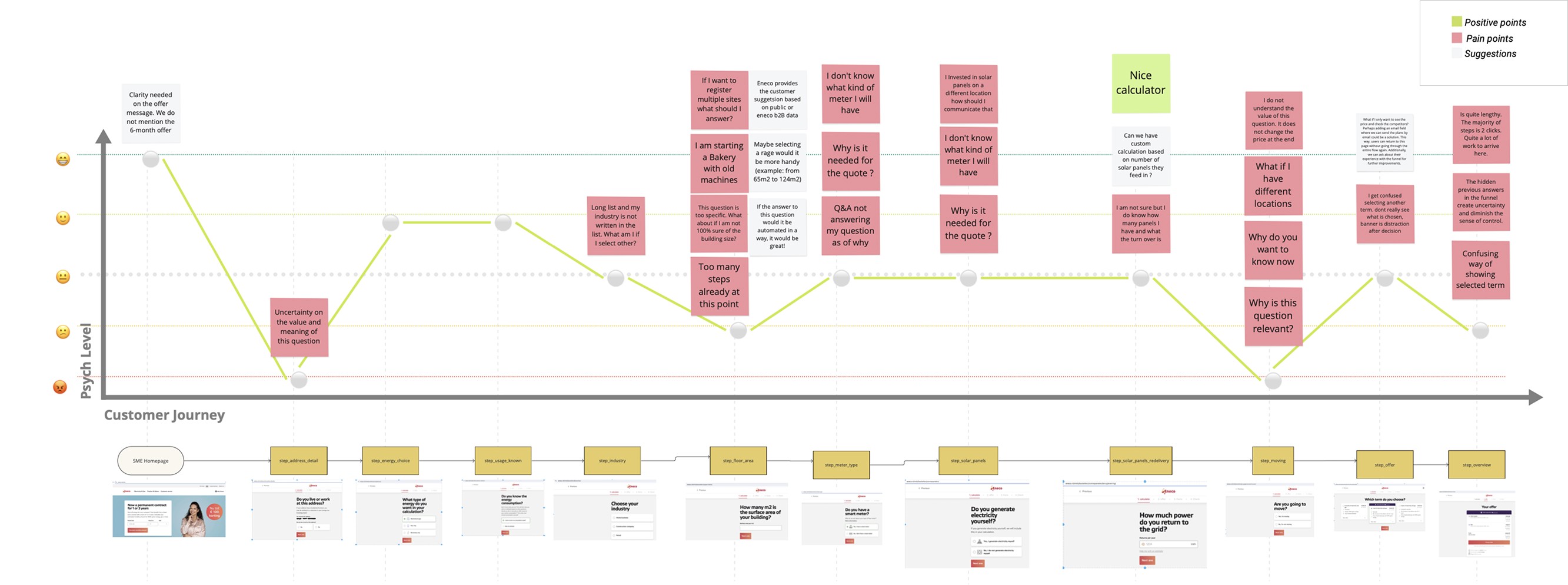 From the workshop, we developed several hypotheses about user experience challenges, which we then validated through user interviews. In the workshop, we used an emotional journey map to understand how users felt at different stages of the funnel. This map showed where users felt frustrated or satisfied. Our goal was to find these key moments and use them to make the user journey smoother and more engaging.