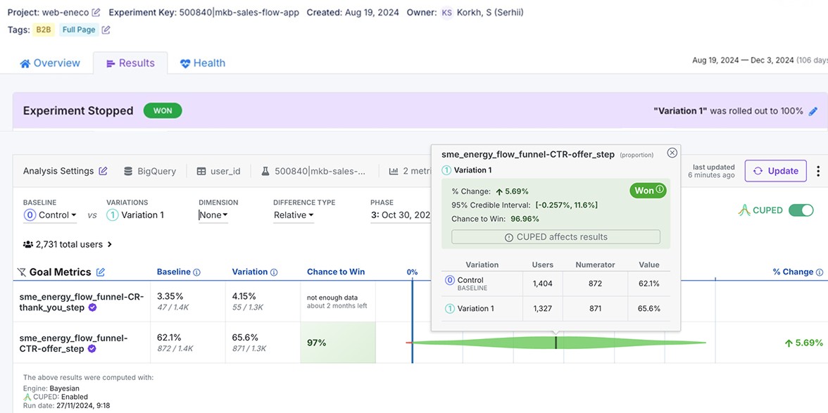 The 50/50 A/B test ran in the Netherlands with 100% statistical confidence. The winning variation was fully implemented, delivering a 65.6% CTR on the offer step (+5.7% uplift) and a 24% lift in final conversions, directly strengthening SME acquisition and monthly recurring revenue.