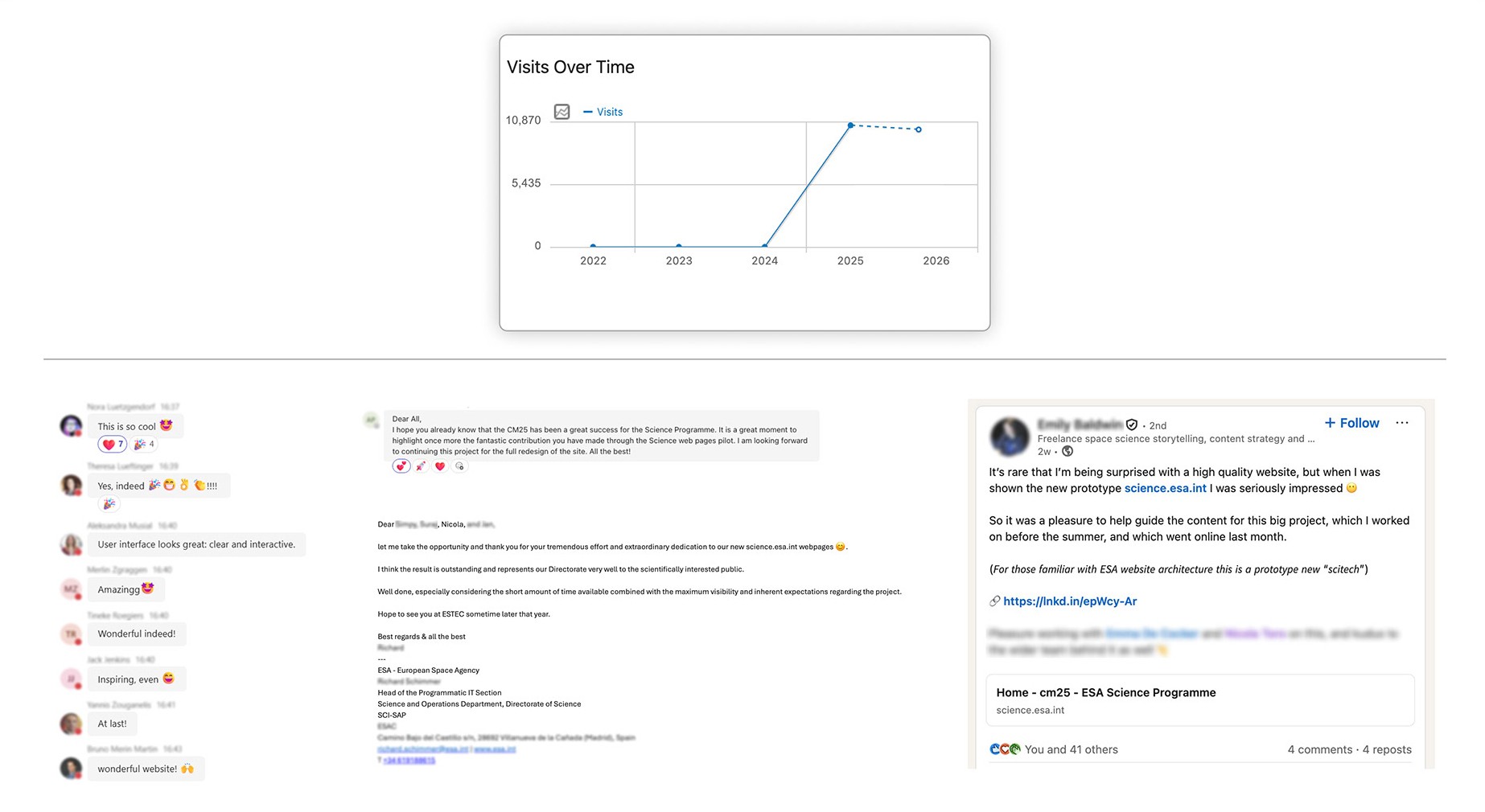 ESA's Science Directorate was losing digital authority to third-party sources, users couldn't find credible information, and search traffic was drifting away from official channels. I designed a strategic UX pilot platform (website) that reclaimed 10,000+ users, re-established ESA as the primary source for space science, and became the tool used by ESA's Director of Science, Carole Mundell, to present the Science Programme at the CM25 Ministerial Council, directly supporting approval of €3.7B in Science Programme funding.