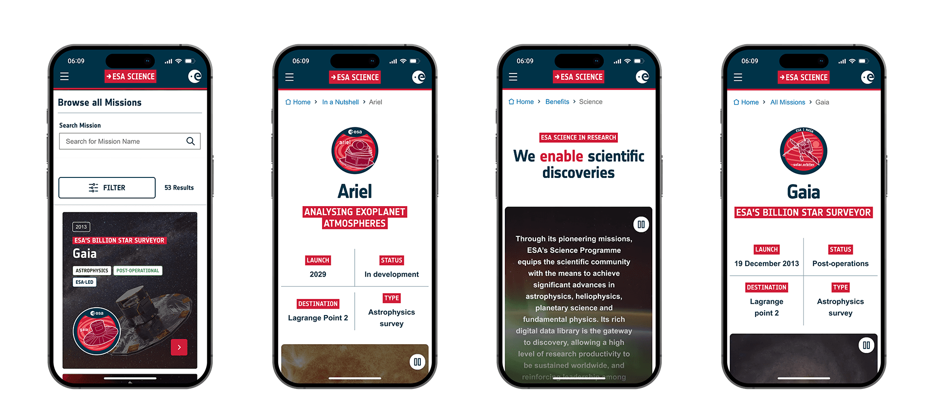 This pilot was delivered by a compact, highly cross-functional team, with me leading UX and strategy end-to-end. I worked in close collaboration with scientists and engineers to ensure full technical and scientific accuracy, translating complex domain knowledge into usable digital experiences without loss of meaning. I partnered with platform architects to align on feasibility, performance constraints, and long-term scalability of the system, ensuring design decisions could be sustainably implemented. In parallel, I coordinated with content specialists to align narrative structure, tone, and messaging consistency across all ESA directorates, ensuring a unified and coherent experience across the ecosystem.